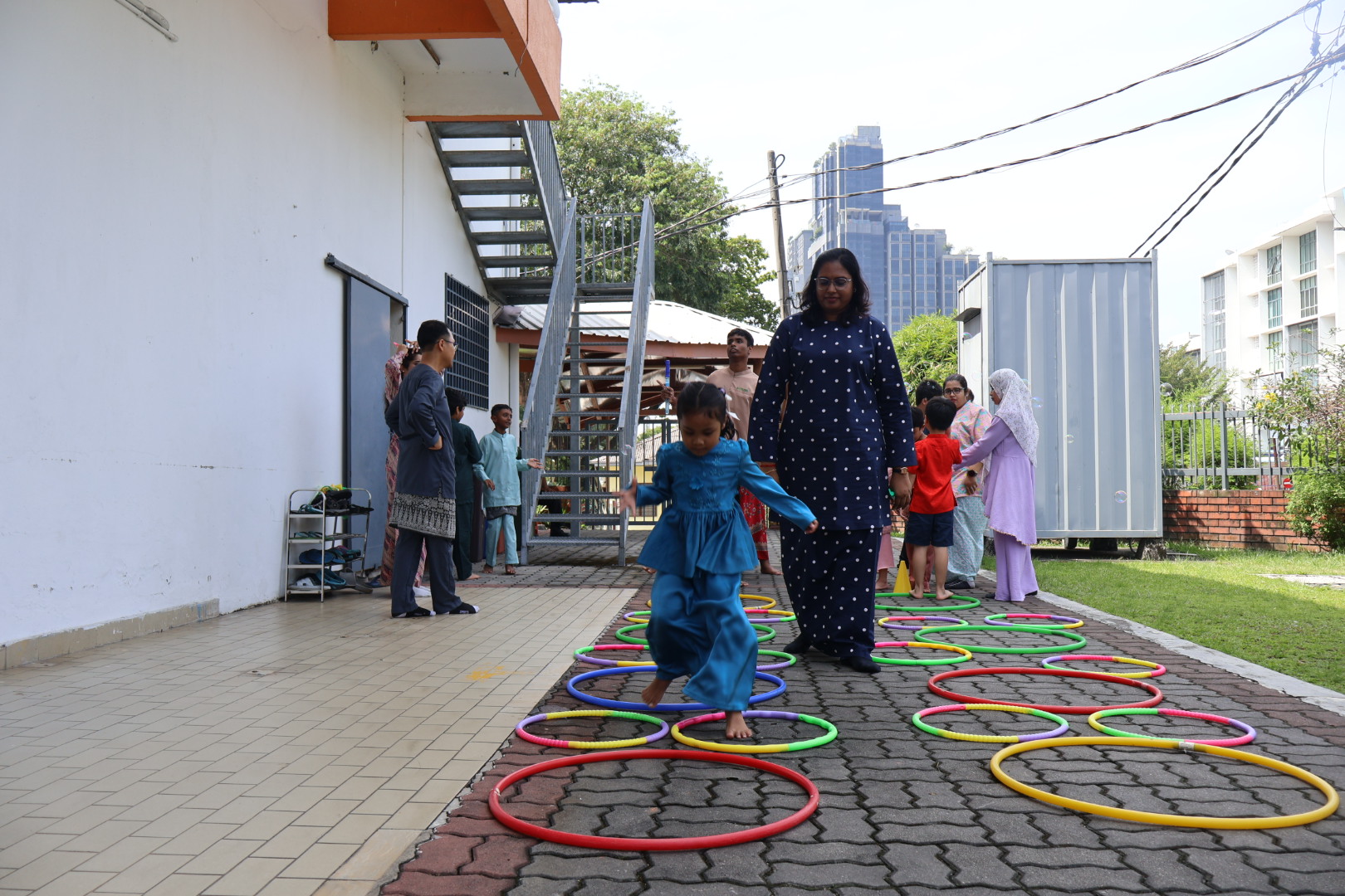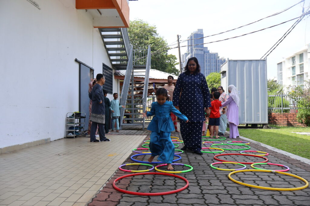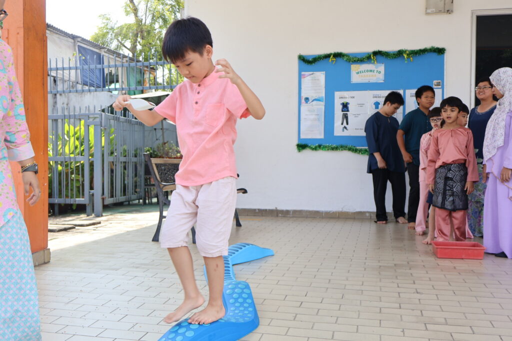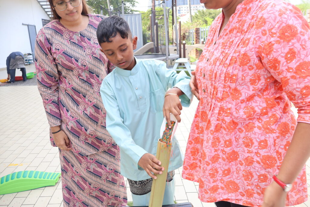 In a nod to traditional Raya food, students participated in a balancing act. They walked across a designated lane while holding spoons filled with colourful rice, which they then used to “fill” a lemang bamboo. This task focused on physical balance and concentration while introducing them to the concept of traditional food preparation.